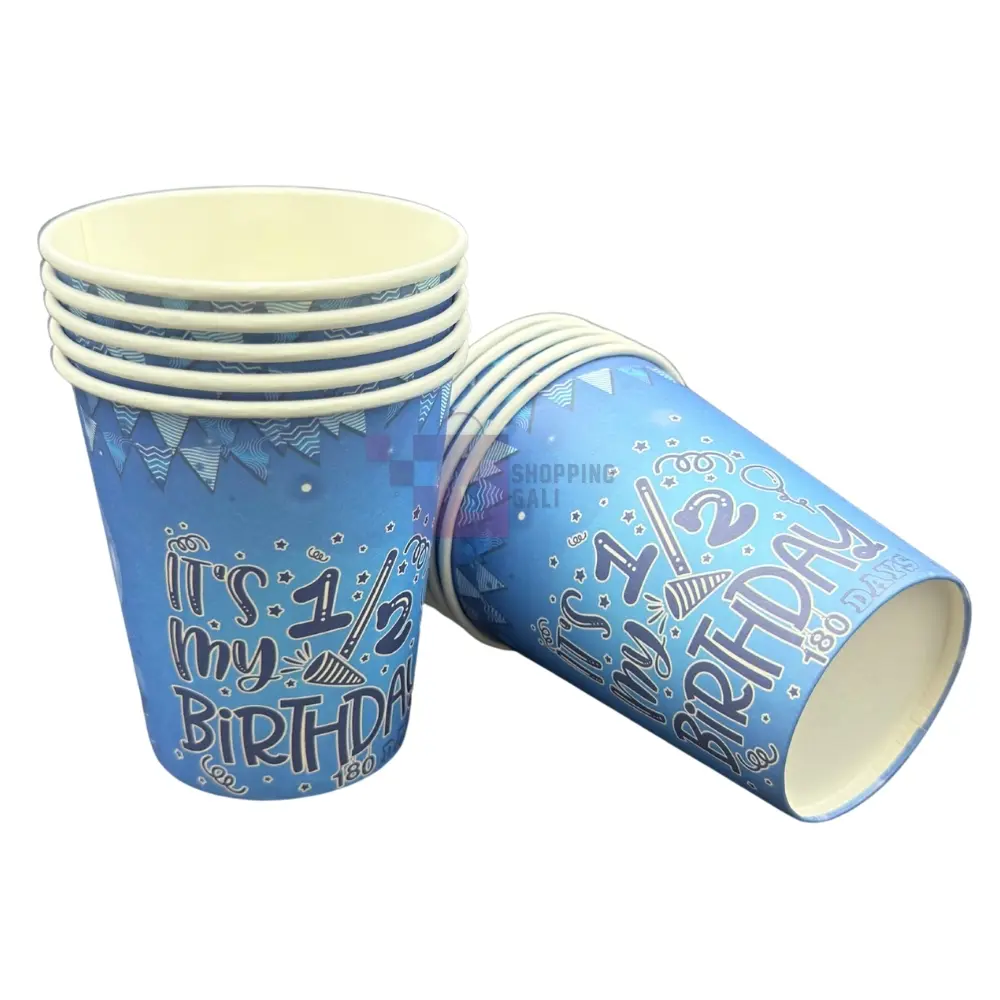 Mark the half-year milestone with these festive 6 Months Cups! Made from durable Paper, these cups feature a charming design with white patterns, stars, and the text "IT'S MY 1/2 BIRTHDAY 180 DAYS" on a deep Blue background. Each cup holds approximately 200 Ml of beverage, making them perfect for soft drinks or juice at a 6 Months Themed Party for Boys. This essential party tableware comes in a Pack Of 10 cups. Product images are original and I hope you will love them.