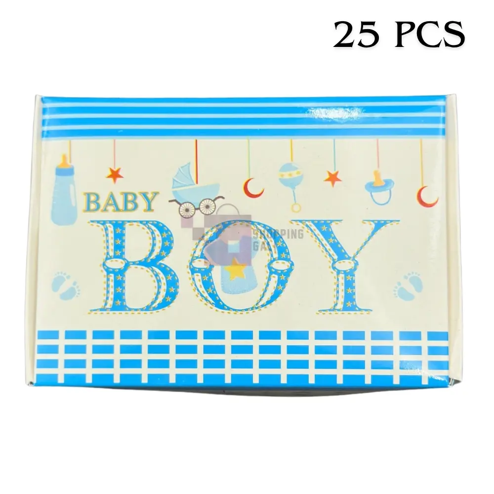 These adorable Baby Boy Sweet Box containers are perfect for celebrating a baby shower, Aqiqah, or a little boy's birthday. Made from sturdy Card material, they feature a charming Blue and white design with the text "BABY BOY" and various baby-themed graphics like bottles and footprints. The assembled box is suitable for approximately 250 Gram of sweets or treats. The dimensions are approximately 4.6 Inch Width x 3.2 Inch Height x 1.6 Inch Depth. This product is included as a Pack Of 25 Boxes. Product images are original and I hope you will love them.