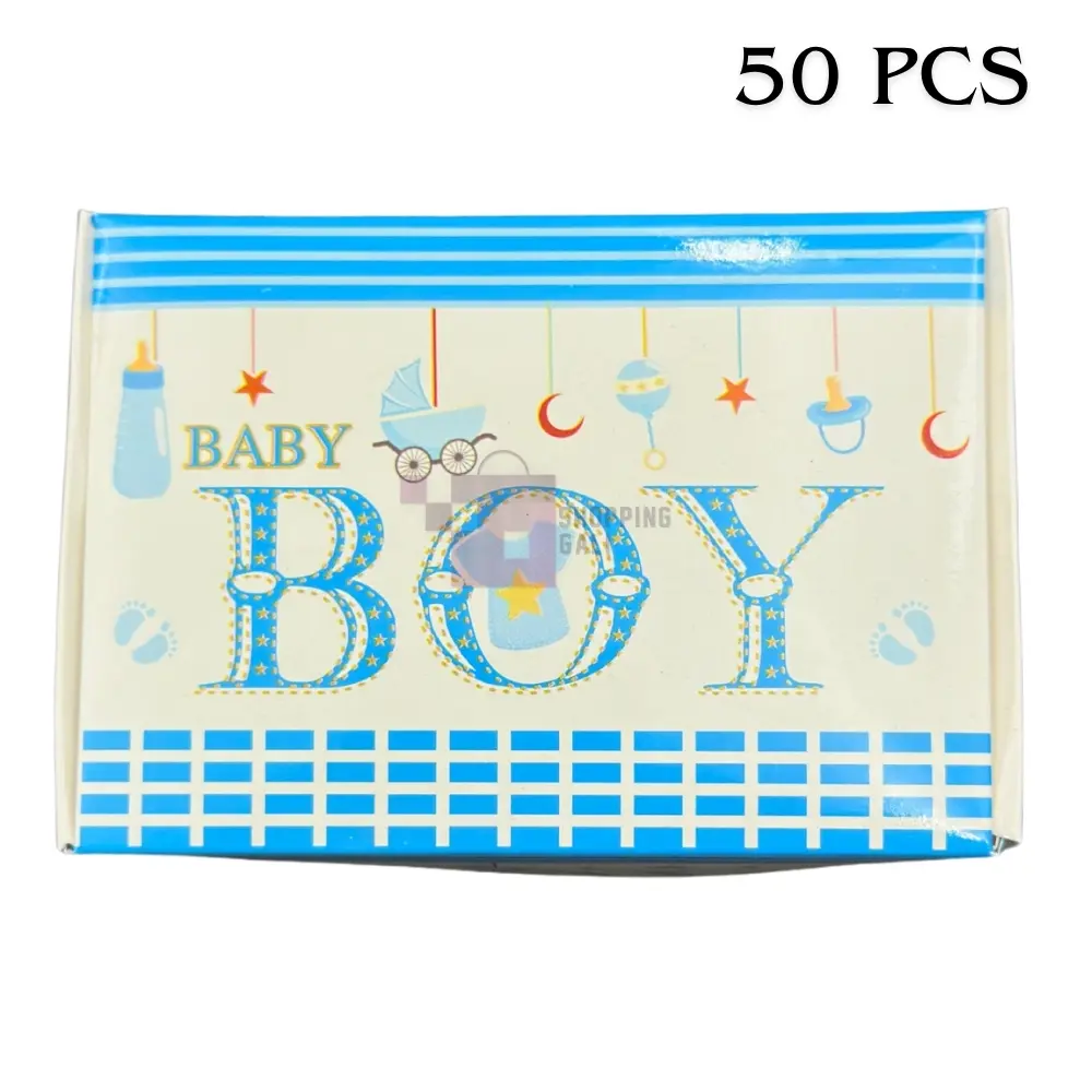 These adorable Baby Boy Sweet Box containers are perfect for celebrating a baby shower, Aqiqah, or a little boy's birthday. Made from sturdy Card material, they feature a charming Blue and white design with the text "BABY BOY" and various baby-themed graphics like bottles and footprints. The assembled box is suitable for approximately 250 Gram of sweets or treats. The dimensions are approximately 4.6 Inch Width x 3.2 Inch Height x 1.6 Inch Depth. This product is included as a Pack Of 50 Boxes. Product images are original and I hope you will love them.