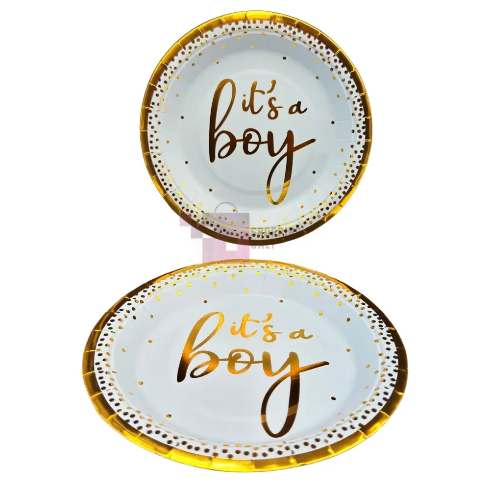 Celebrate your little one's arrival or baby shower with these charming "It's A Boy" Plates. Made from durable Paper, these plates feature a crisp white background with elegant Golden script that reads "It's a boy," surrounded by a golden dotted border. The primary color theme is Blue and Golden. Each plate measures approximately 7 Inch in diameter, making them ideal for cake or appetizers, and they are specifically themed for a Boy event. This essential tableware comes in a Pack Of 10 plates. Product images are original and I hope you will love them.