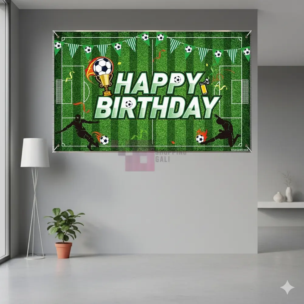 Score a goal with this vibrant Football Birthday Party Banner! Made from durable Panaflex material (as implied by the product type), this banner is designed to look like a realistic Green soccer field with vertical striped markings. It features a large gold trophy, silhouettes of two football players, and festive green and white bunting with soccer balls. The bold text in the center reads "HAPPY BIRTHDAY" in a grassy-texture font. This banner is approximately 36 Inch By 24 Inch in size, making it the perfect photographic backdrop for a Football Themed Party for Boys. This decoration comes as a single Pack Of 1 banner. Product images are original and I hope you will love them.