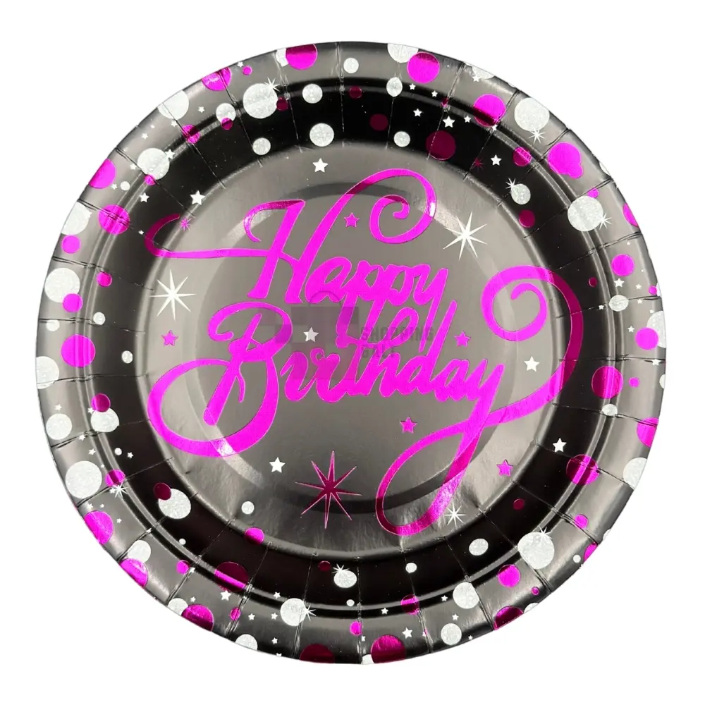 Serve up the cake in style with these festive Happy Birthday Paper Plates. Made from durable Paper, these plates feature a dramatic Black background with eye-catching Pink metallic foil script that reads "Happy Birthday," surrounded by pink and white polka dots and silver stars. Each plate measures approximately 7 Inch in diameter, making them ideal for appetizers or dessert, and they are perfect for a Girls birthday celebration. This essential tableware comes in a Pack Of 10 plates. Product images are original and I hope you will love them.
