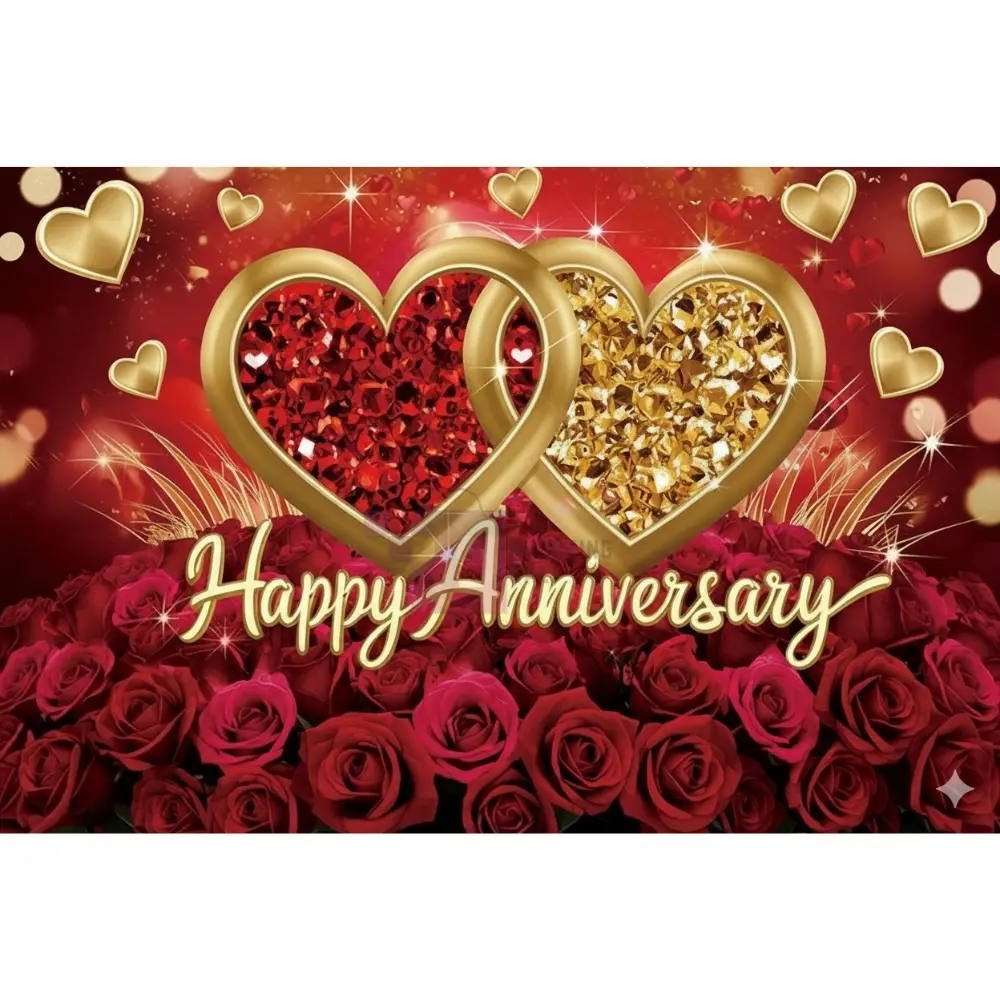 Celebrate a special milestone with this romantic Happy Anniversary Banner! Made from durable Panaflex material, this banner features two interlocked hearts, one filled with glittering Red jewels and the other with Golden jewels, set against a shimmering red and bokeh background. The base of the banner is adorned with a lush bed of deep red roses. The text "Happy Anniversary" is displayed in a flowing, gold-colored script. This banner is approximately 36 Inch By 24 Inch in size, making it a beautiful photographic backdrop for an Anniversary Themed Party or celebration for a couple (Unisex). This decoration comes as a single Pack Of 1 banner. Product images are original and I hope you will love them.