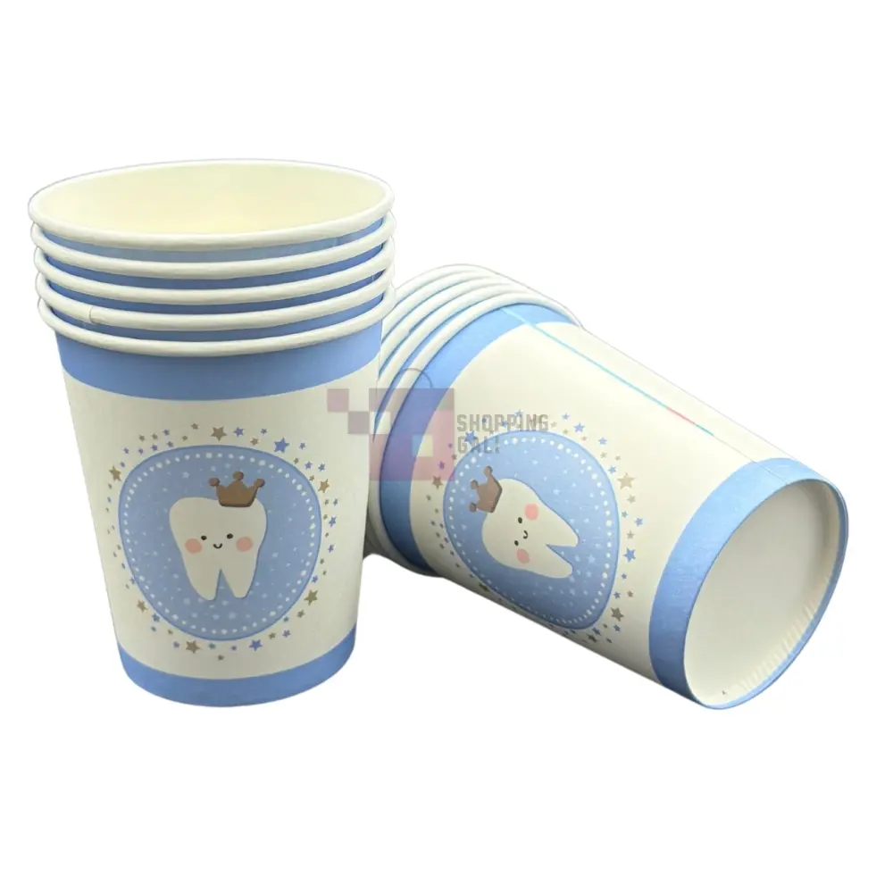 Celebrate your little one's milestone with these adorable First Teeth Cups! Made from durable Paper, these cups feature a charming design with a cute, crowned tooth character at the center, surrounded by stars and a Blue and white pattern. Each cup holds approximately 200 Ml of beverage, making them perfect for soft drinks or juice at a First Teeth Themed Party for Boys. This essential party tableware comes in a Pack Of 10 cups. Product images are original and I hope you will love them.