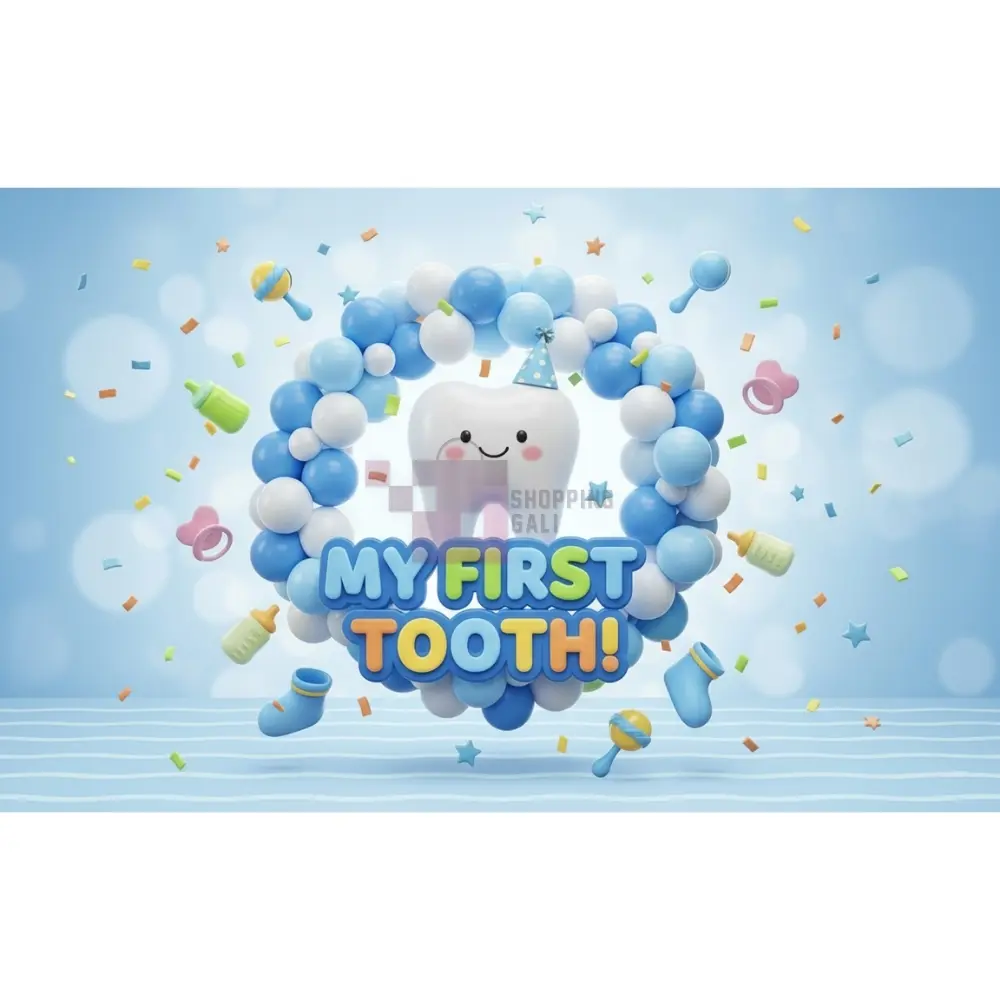 Celebrate a major milestone with this charming My First Tooth Banner! Made from durable Panaflex material , this banner features a large, smiling tooth character wearing a small party hat, framed by a wreath of blue and white balloons. The Blue background is scattered with confetti, baby bottles, pacifiers, and rattles. The text reads "MY FIRST TOOTH!" in a colorful, fun font. This banner is approximately 36 Inch By 24 Inch in size, making it a perfect photographic backdrop for a Teeth Themed Party or celebration for Boys. This decoration comes as a single Pack Of 1 banner. Product images are original and I hope you will love them.