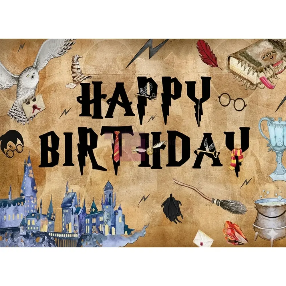 Transport your party guests straight to the Wizarding World with this magical Harry Potter Banner! Made from durable Panaflex material , this banner features a parchment-like, Beige background covered in iconic symbols like Hedwig the owl, the Hogwarts castle skyline, the Golden Snitch, and a witch's cauldron. A bold, striking font announces "HAPPY BIRTHDAY". This banner is approximately 36 Inch By 24 Inch in size, making it a fantastic photographic backdrop for a Harry Potter Themed Party for any fan (Unisex). This decoration comes as a single Pack Of 1 banner. Product images are original and I hope you will love them.