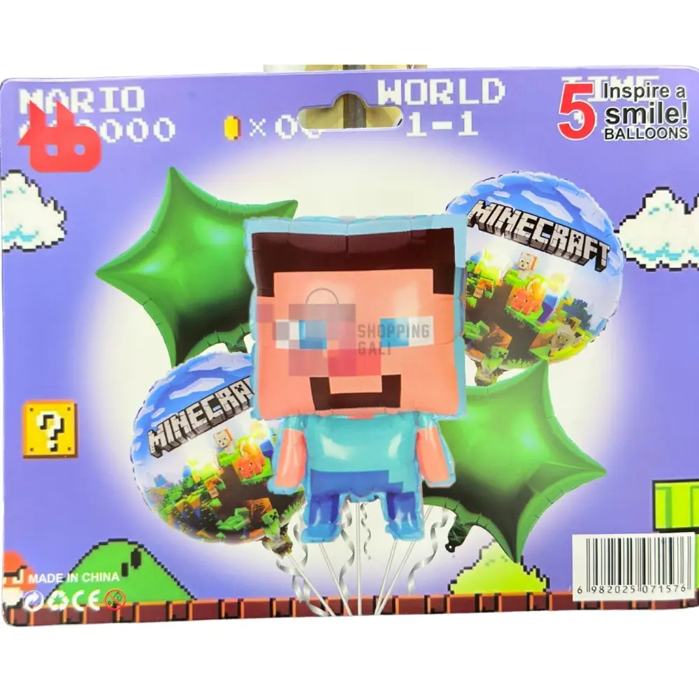 Build an awesome party atmosphere with this fantastic Minecraft Foil Balloon Set! This set includes 5 Foil Balloon pieces, featuring one large central character balloon (Steve) and four smaller balloons. The smaller balloons include two round Minecraft-themed landscape balloons and two green star-shaped balloons. The primary color theme is Green and blue, perfect for a Minecraft Themed Party for Boys. This balloons are approximately 18 Inch in size. Product images are original and I hope you will love them.